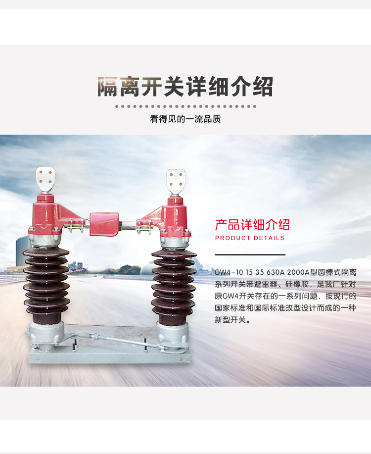 GW4-40.5(630/1250)系列户外高压隔离开关 ,是三相交流50Hz的户外高压电器设备。适用于发电厂、变电站及大型工矿企业的三相交流50Hz户外电力系统中 ,供高压线路在无功情况下进行换接,以及对被检修的高压母线、断路器等电器设备与带电的高压线路进行电器隔离和分、合电路之用。具有安全可靠 、操作轻便 、灵活等特点。